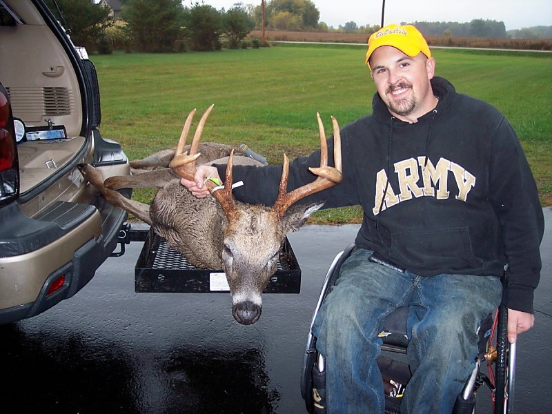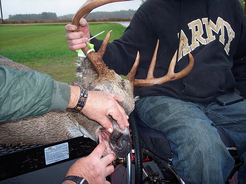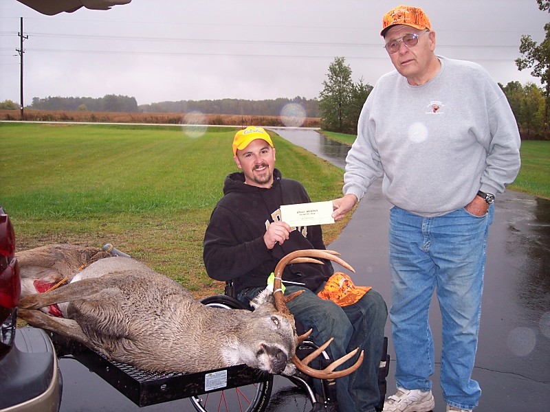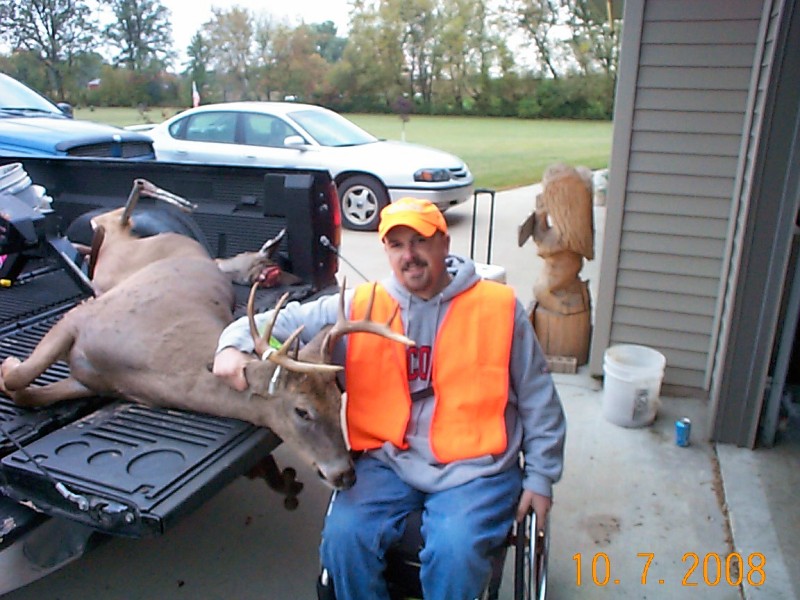 These pix are of Lee Krumbach who has been handicapped the past 10 years. For the last three years he has killed a doe and a buck. Last year's buck was a 10 pointer and was the biggest of all the handicapped kills. This year he got this monster, 253 lbs field dressed, 8 points, and not a tooth in his mouth. He won a free $395.00 head mount for the biggest buck in the handicapped hunt