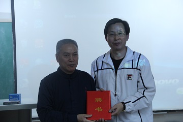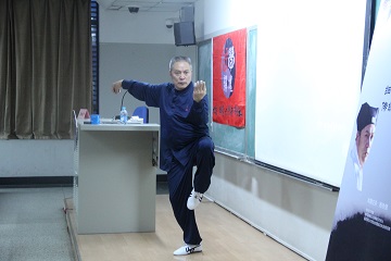 讲座正式开始前,武术学院院长张强强老师为萧铁僧老师颁发第三十期《武学讲坛》主讲嘉宾聘书。萧铁僧老师首先向现场观众介绍了“府内派传统太极拳”的起源及其传承的脉络,随后又向观众讲述了自己多年的拜师与习武经历。当讲到自己第一个师父就是萧老师的父亲时,萧老师潸然泪下,可见萧老师对自己的父亲怀念之深,及父亲对其影响之大。在讲座中,年近七十的萧老师不仅向大家详细介绍了“府内派传统太极拳”的拳理与功法,还亲自示范和演练技术动作,将其外在的技击和内在的养生充分展现出来,赢得了在场师生阵阵掌声。