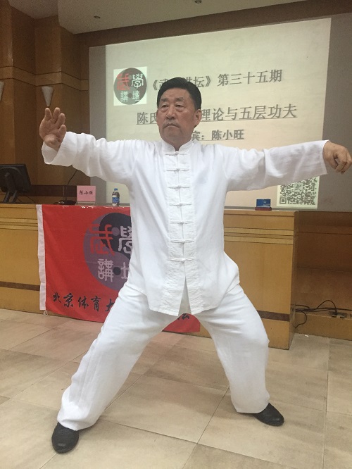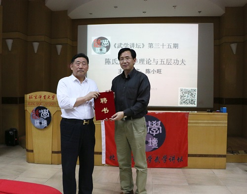 讲座伊始,张强强院长首先为陈小旺老师颁发《武学讲坛》第三十五期主讲嘉宾聘书。随后,陈老师说到,他在几十年的武学修习和探索过程中走了不少的弯路,之所以来参加这个讲坛,就是分享自己的经验心得,让后进武学者们借鉴,少走弯路。并以“修身”和“养性”为两条主线,以“五层功夫”为总纲领,具体的讲述了在实操练拳中的弊害以及日常生活中的太极哲理。陈老师讲课语言简朴、比喻生动,谦虚幽默,为了能够让我们更加清晰地认识和体会,陈老师举了大量的具体事例,把太极的五层功夫和太极拳的阴阳转换关系,简明扼要的由浅入深的讲得浅显易懂、清晰透彻。让现在听众醍醐灌顶、获益良多。整个讲座时间共持续了两个小时,陈老师一刻未停。我们不仅为陈老师“行为人师,德为人范”的师德感动,更为陈老师“满腹经纶、德艺双馨”的学识所折服。最后,陈老师为大家亲自演练了新架陈式太极拳,精湛的技艺赢得阵阵掌声,也为本次讲座画上了圆满的句号。