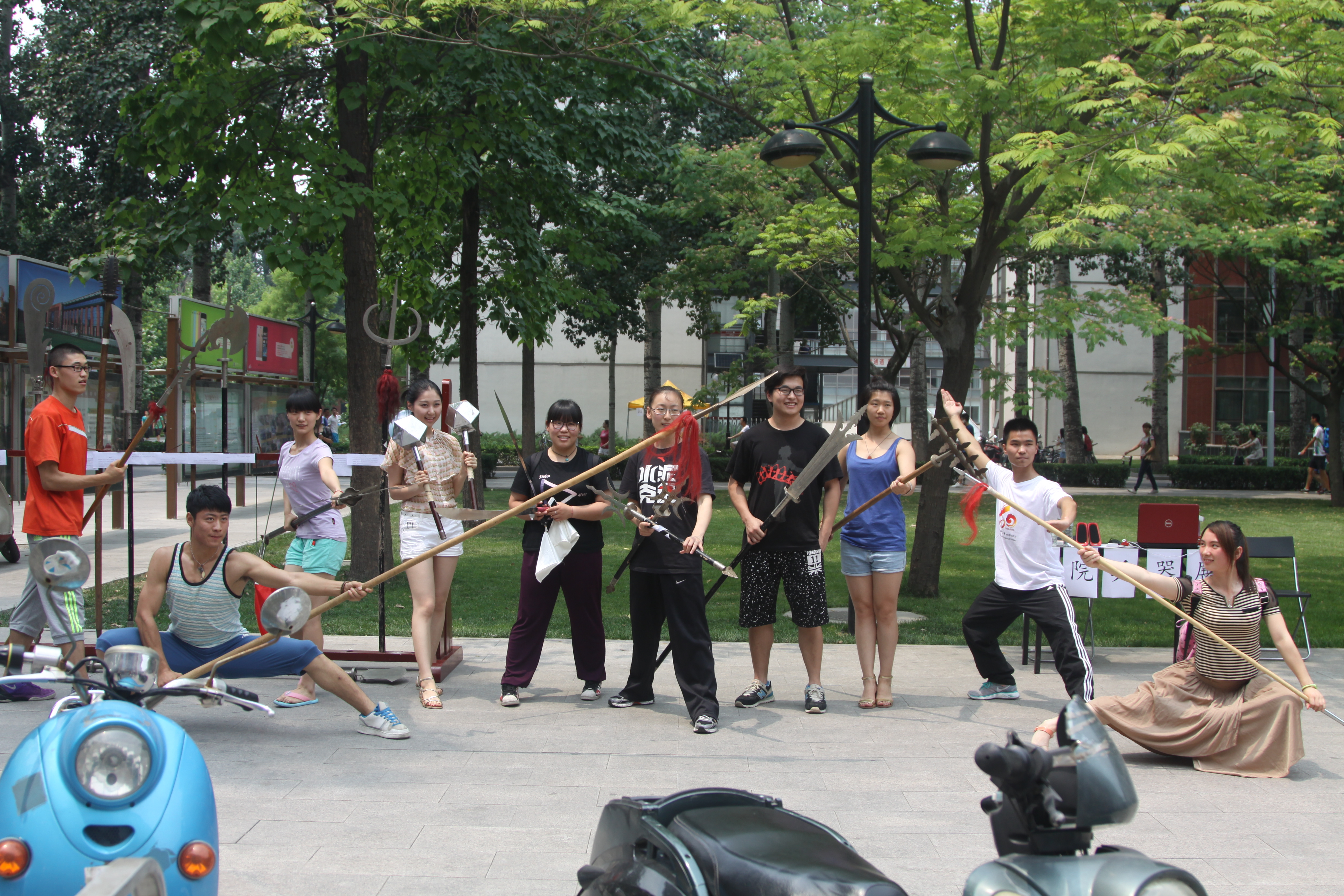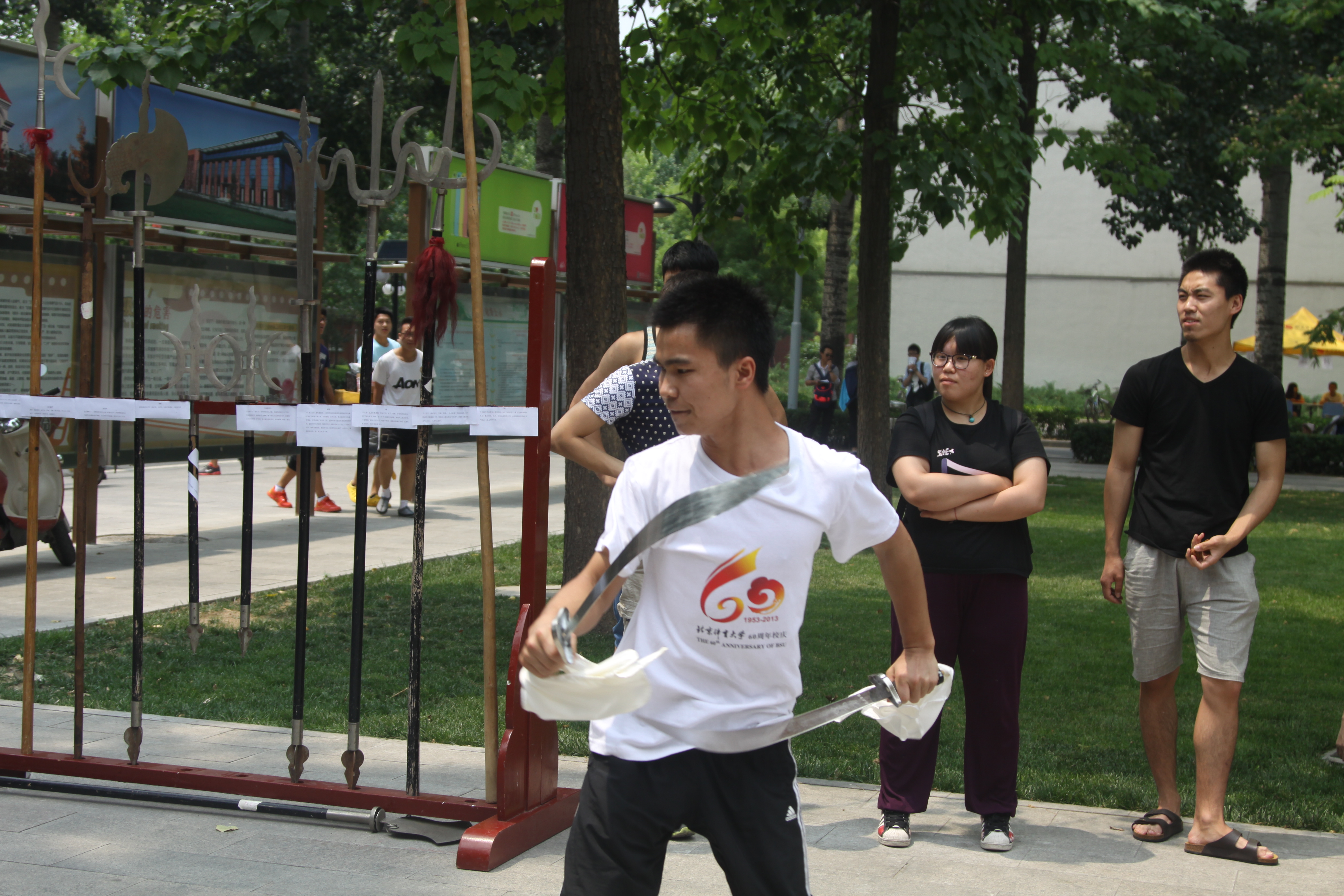 活动于中午在学校食堂门口正式开展,现场摆放戟、钩、叉、锤、鏜、流星锤、狼牙棒等多种稀有兵器共同学参观试用。随后,武术学院2012级和2013级的多位同学进行了双刀、双剑、苗刀、天岐棍等传统兵器的精彩表演,现场观众阵阵喝彩,气氛相当活跃。活动过程中,工作人员为现场同学详细讲解各种兵器的使用情况和发展历史,使同学们对传统兵器产生了浓厚的兴趣,并拍照留念,活动结束后,学生会成员拿兵器进行了合影留念,整个活动开展得十分顺利。