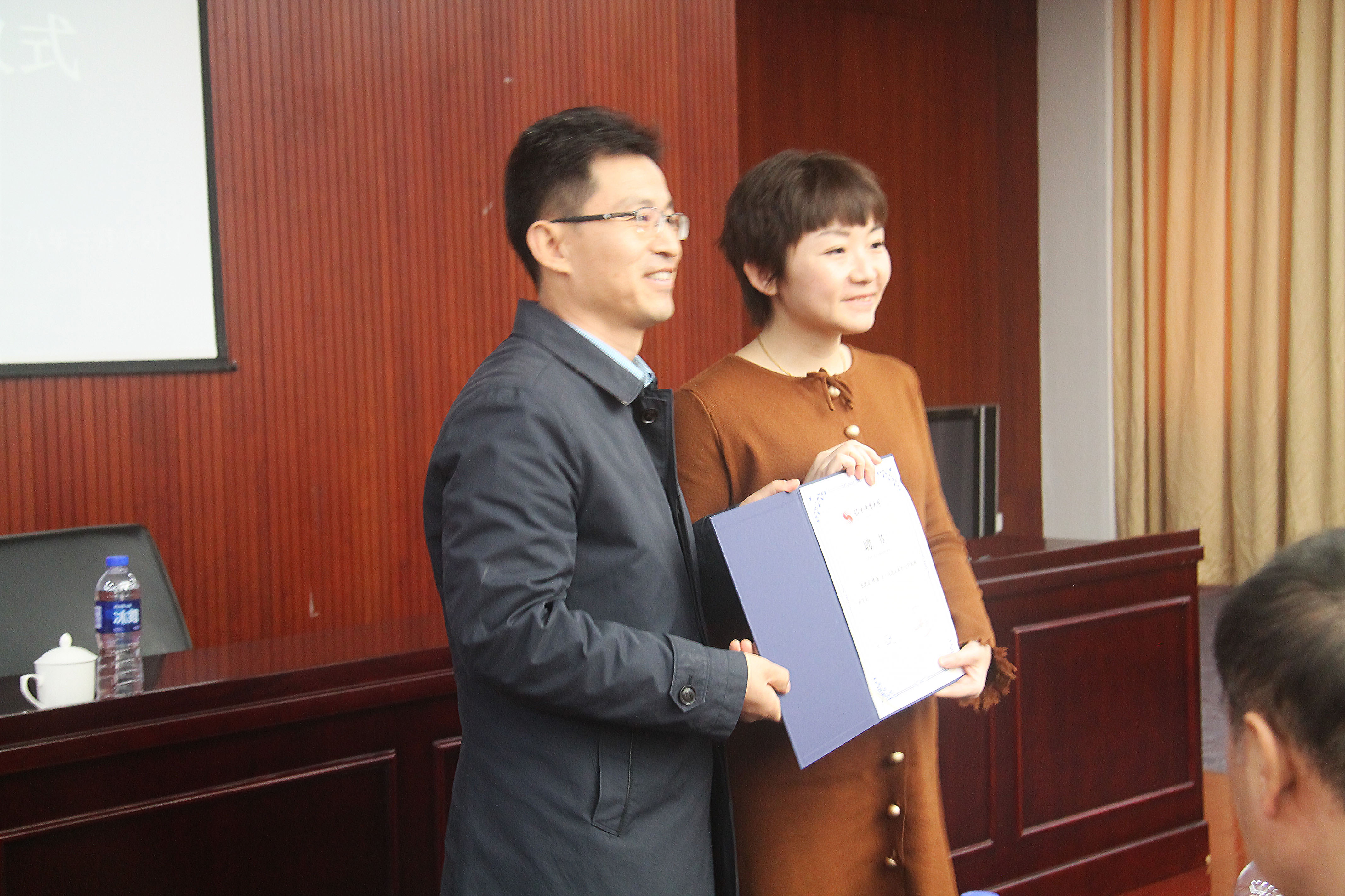 人事处叶楠副处长宣读了学校的聘任决定,党委副书记樊战备为邢蕾副教授颁发了聘书。邢蕾副教授在发言中谈到对于英国上市公司365的聘任感到非常自豪,十分感谢英国上市公司365的认可,并且希望运用所学知识在武术文化研究上发挥自己的特长,为武术与民族传统体育学院的发展贡献力量。