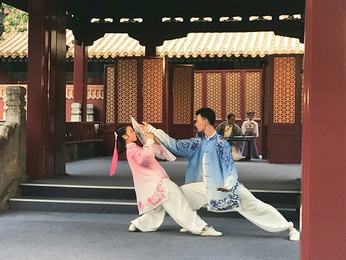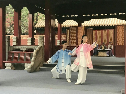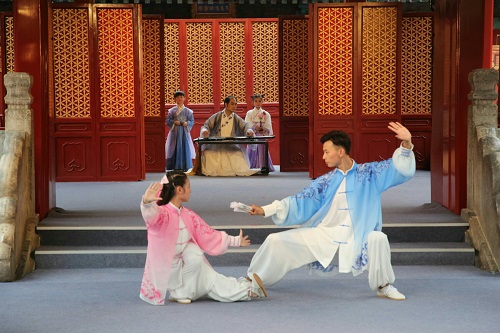 我院学生2016级学生黄雪晴和已毕业的2012级的杜小帅参加了《山居吟》的表演,他们表演的太极拳和古琴配合完美演绎出中国传统文化的底蕴。两人在这次表演中演绎的是男女混合双人太极拳,动静结合,刚柔并济,如行云流水般与古琴配合融洽,以最高的水平为彭妈妈和各国的夫人们表演,表演结束后得到了彭丽媛教授及各国领导人配偶热情赞扬和好评! 活动结束后,彭丽媛教授说:今天我们一同体会了历史悠久的中华文化,也体会了千百年来中国同“一带一路”沿线国家绵延不断的人文交流。我们共同祝愿中国同各国的友好交流合作取得更加丰硕成果。