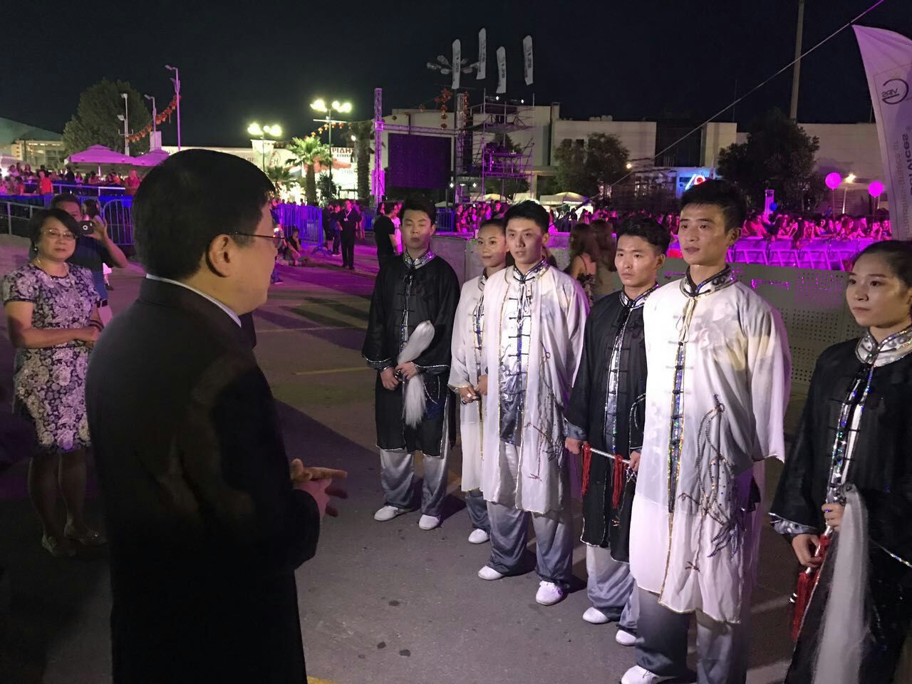 10名同学连续三天在希腊塞萨洛尼基国际博览会上为希腊的观众们奉献了三场高水准武术专场节目。希腊总理齐普拉斯,中国驻希腊大使邹肖力及其夫人出席现场并观赏了演出,活动结束后,大使高度评价:“你们演出非常精彩、圆满成功,现场的希腊观众反响热烈,频频鼓掌。我看了你们的演出也非常激动,音乐很振奋人心,视频制作很精彩!节目编排别出心裁,独具中国特色。我们此次博览会以商贸为主,我国的公司展示了中国的发展和实力,这次中国主宾国活动只有你们武术节目一个文化项目,这是“经贸搭台,文化唱戏。”你们演的非常好,展示了中国文化的精髓和博大精深,祝贺你们演出圆满成功!在演出的过程中萨博会主要负责人Andreas就发来祝贺短信:Its a beautiful show, I like it very much. Thank you for the show! 演出结束后,后台的技术人员、现场主持人、之后表演的希腊乐队成员纷纷向我们演员竖起大拇指,表示祝贺,表示非常喜欢这场精彩的武术节目,明后天要呼朋引伴的前来观看!