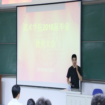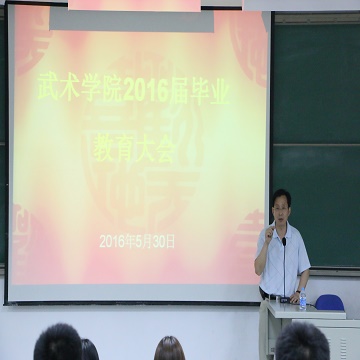 2016年5月30日晚上7:00,武术学院2012级在地下报告厅召开毕业生离校教育及武术专场招聘会。武术学院院长张强强、办公室主任于昕、2012级辅导员彭翔吉、套路教研室段永斌、山东智现体育有限责任公司,2012级全体在校学生共同参与了此次会议。会议由2012级辅导员彭翔吉主持。