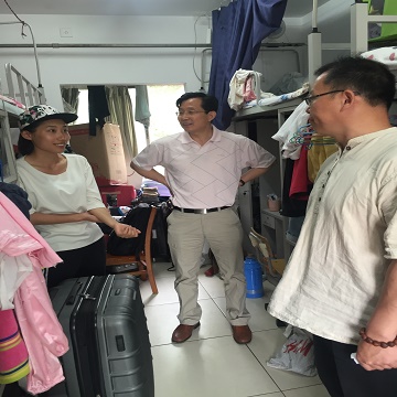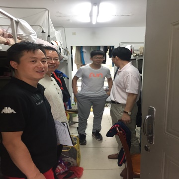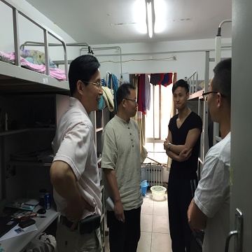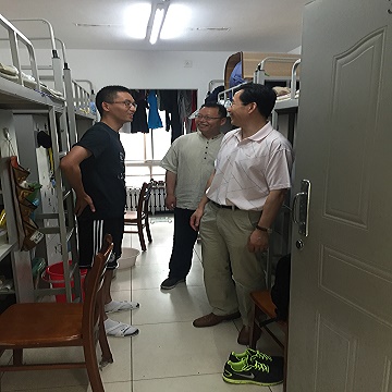 随着毕业季的来临,又一届武院学子即将踏上人生新的征途,扬帆起航。5月31日上午11点,学院领导、辅导员、各教研室负责人兵分三路,有针对性、目的性的前往各年级进行宿舍检查。院长张强强、散打教研室主任李印东和研究生辅导员滕树云老师来到研究生宿舍,看望慰问即将离开母校的2016届毕业生。