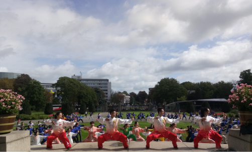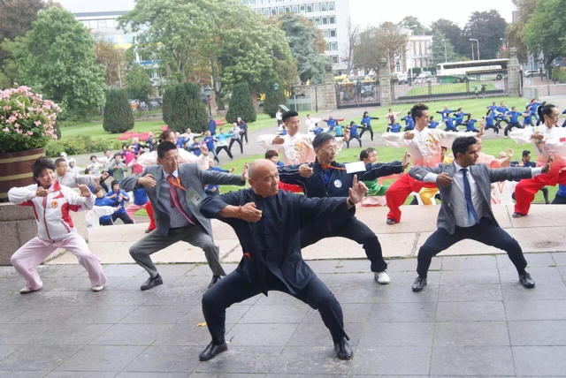 图为在荷兰海牙著名的“和平宫”前,由国际气功联合会领导、中国代表队带领与会人员进行健身气功展示。