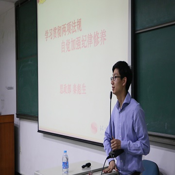 本次会议邀请了思政部秦彪生老师做《学习贯彻两项法规、自觉加强纪律修养》的主题讲座。秦彪生老师从三个方面进行了细致的讲述:一、修订《准则》和《条例》的总体考虑;二、《准则》和《条例》的相关精神;三、贯彻、落实《准则》和《条例》;受到了老师和同学们的热烈欢迎。