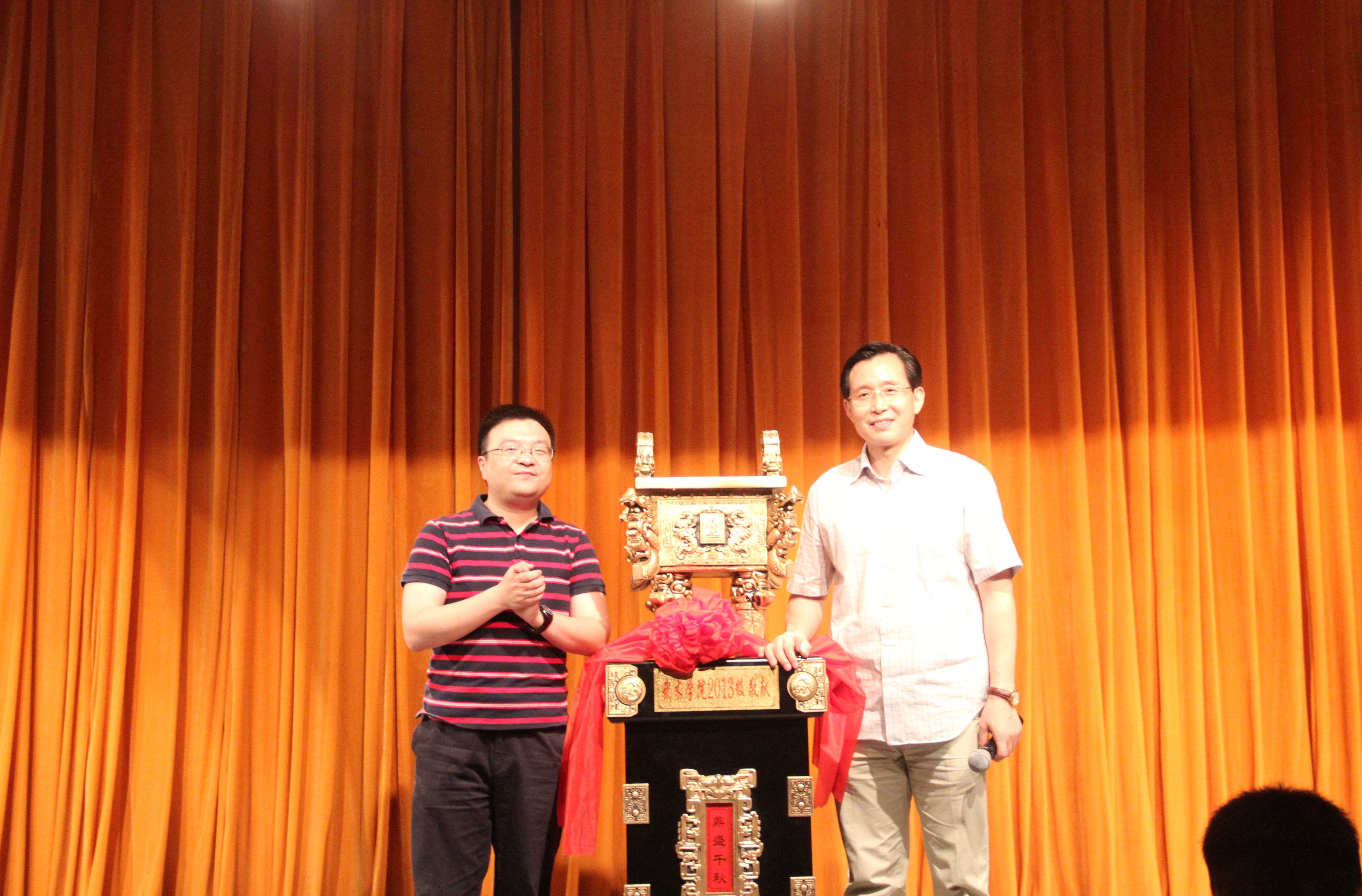 接下来,2013级辅导员朱国栋老师代表全体同学们带着对武术学院的感激之情,向武术学院赠送了礼物“鼎盛千秋”。“鼎”象征着发展与昌盛,表达了毕业生们对武术学院深深地祝福之情,祝愿武术学院越来越好,越来越强。