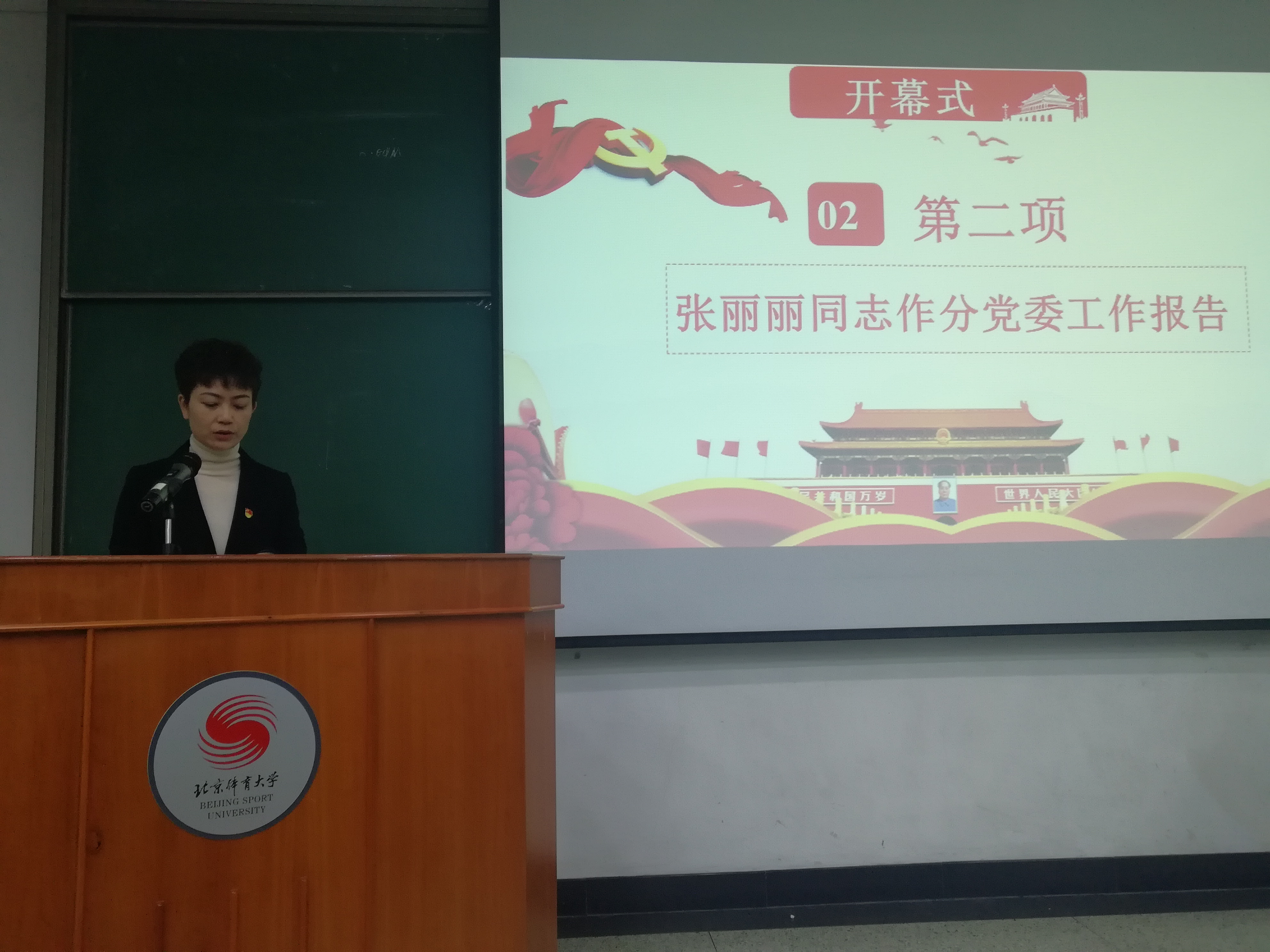 大会在庄严的国歌声中拉开序幕。武术与民族传统体育学院分党委书记张丽丽同志作了题为《凝心聚力,改革创新,为开创学院跨越式发展的新局面而努力奋斗》的工作报告。报告总结了过去五年来学院分党委在党的建设、师德师风、学生思想政治教育、教学训练、综治维稳和学习贯彻落实十九大精神等方面所做的工作及取得成绩,对今后五年的主要工作进行了规划部署,明确了学院发展的奋斗目标和努力方向。最后,张丽丽书记号召全院师生以十九大精神为指引,积极贯彻“四个全面”,牢牢树立“四个意识”,围绕学校和学院中心工作,凝心聚力,求真务实,解放思想,改革创新,为建设世界一流的武术与民族传统体育学院而努力奋斗!